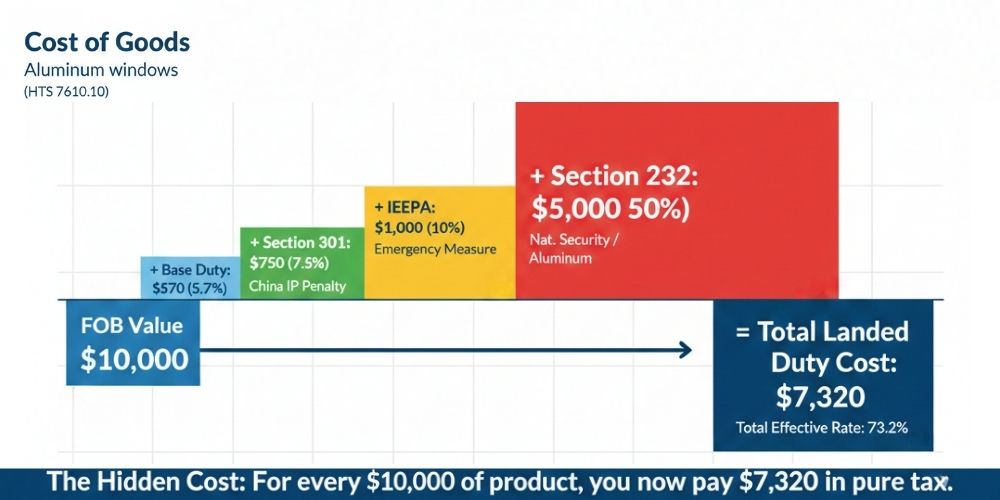 Aluminum doors, windows, and frames under HTS 7610.10 have been hit by three primary policy tools: Section 232 (national security tariffs on metals), Section 301 (tariffs specifically targeting China), and IEEPA (emergency tariffs added in 2025).